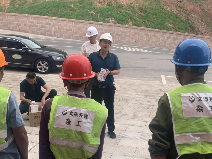 在熊貓高地和皇茶項目,王躍分別向戶外高溫作業(yè)下的現(xiàn)場施工人員及管理人員派發(fā)藿香正氣液、礦泉水等防暑降溫物資,把清涼送到了生產(chǎn)一線,把關(guān)懷送到了員工心坎。他首先感謝大家克服高溫炎熱、盡職盡責(zé)的工作,并叮囑大家在保證安全生產(chǎn)的同時,一定要注意做好防暑降溫工作,避免中暑,將自己身體健康放在首位,為公司發(fā)展再建新功。