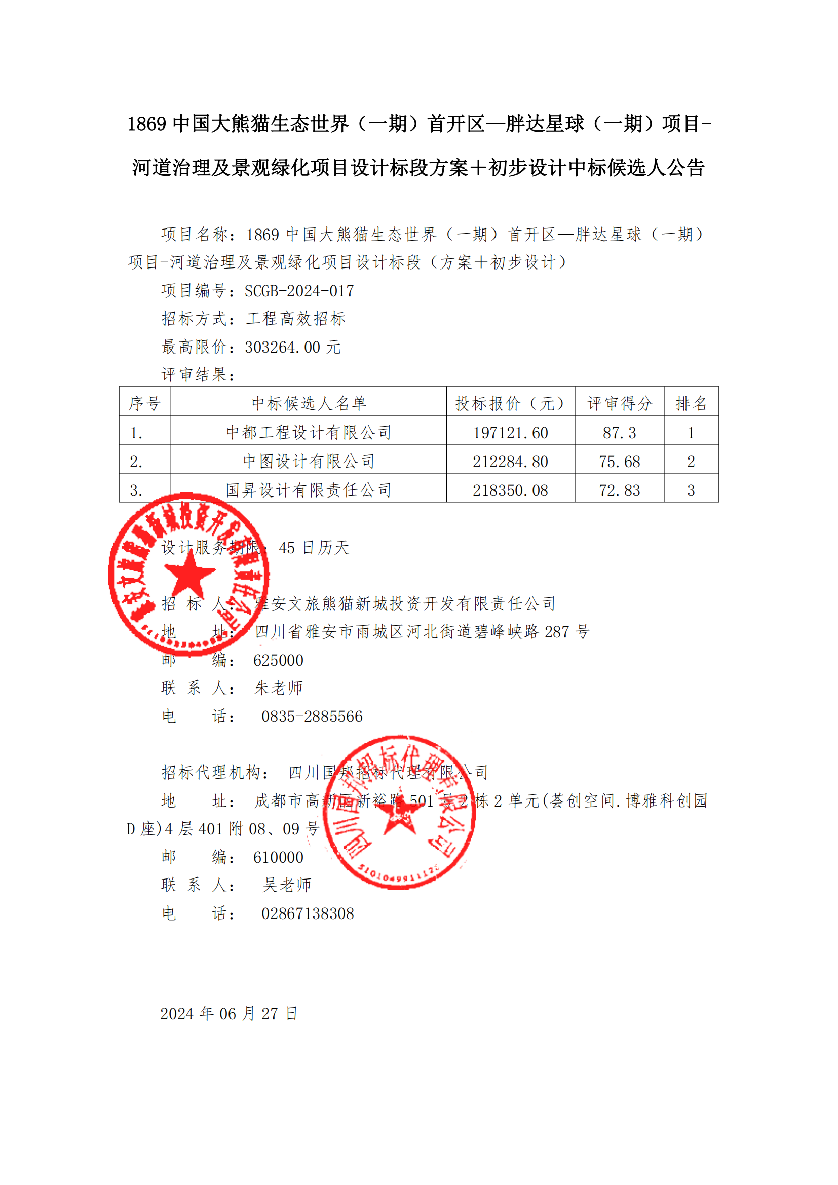 1869中國大熊貓生態(tài)世界(一期)首開區(qū)—胖達星球(一期)項目-河道治理及景觀綠化項目方案+初步設計中標候選人結果