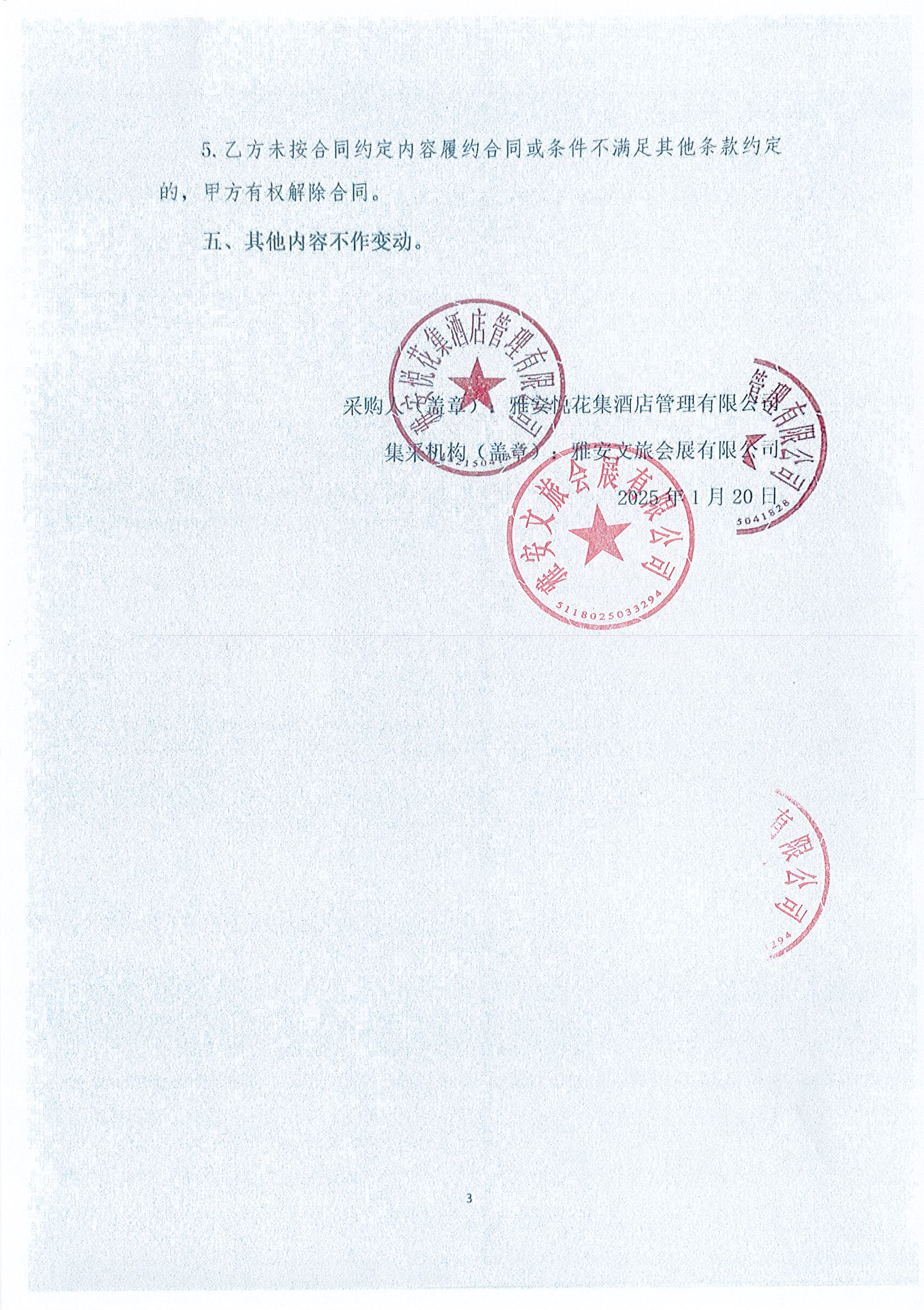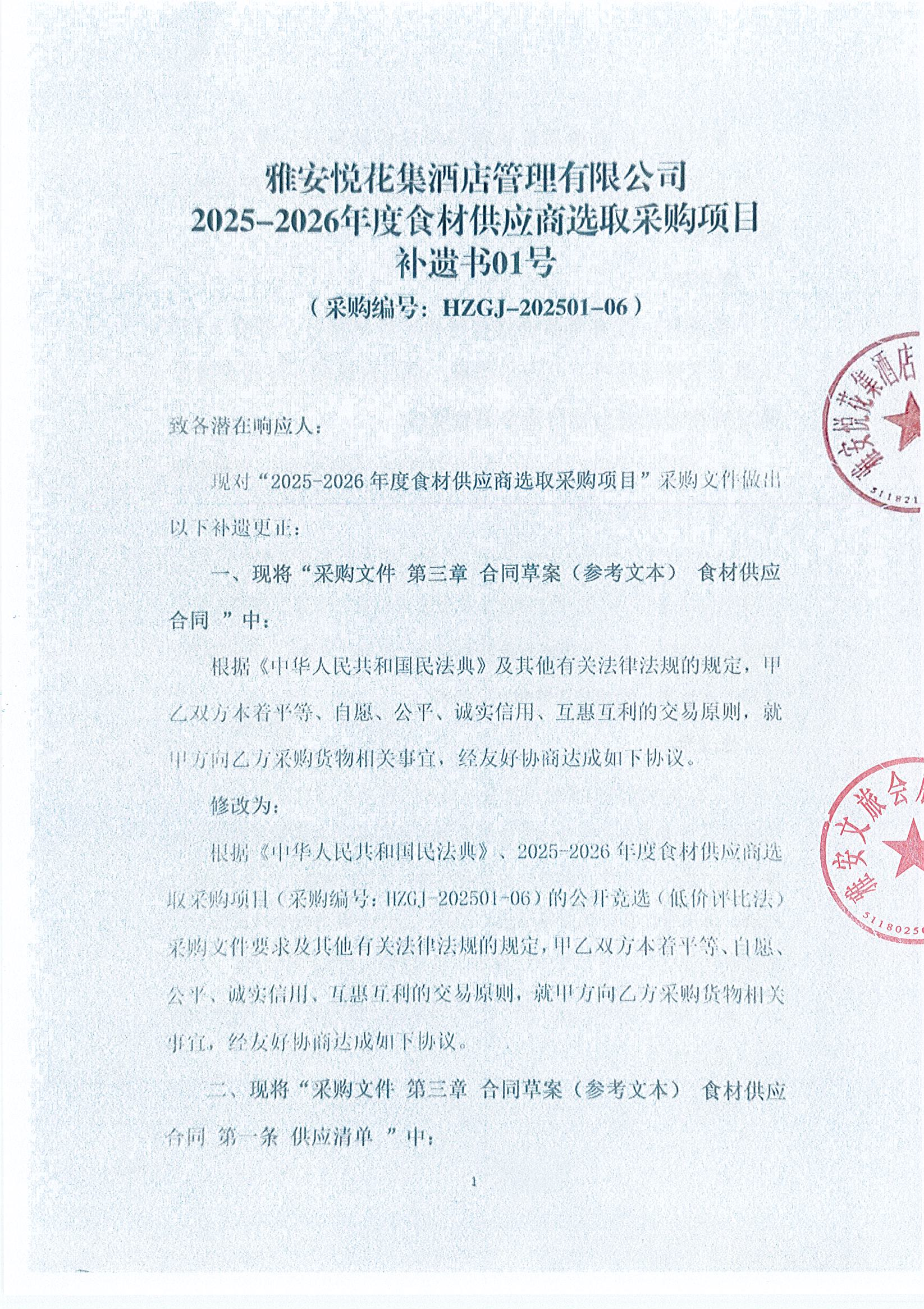 雅安悅花集酒店管理有限公司 2025- 2026年度?材供應(yīng)商選取采購項目 補遺 書01號