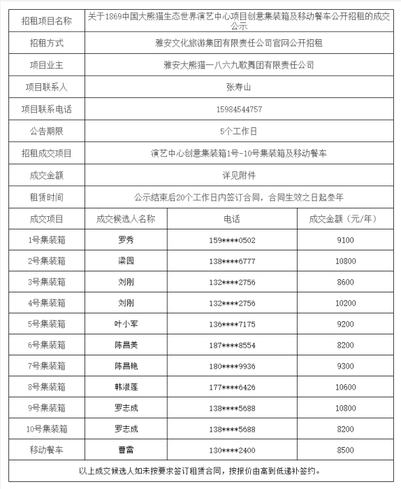關(guān)于1869中國大熊貓生態(tài)世界演藝中心項目創(chuàng)意集裝箱及移動餐車公開招租的成交公示
